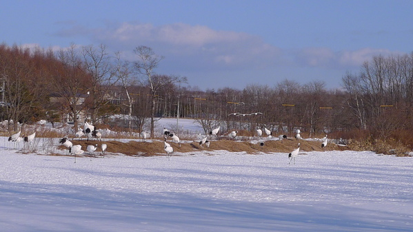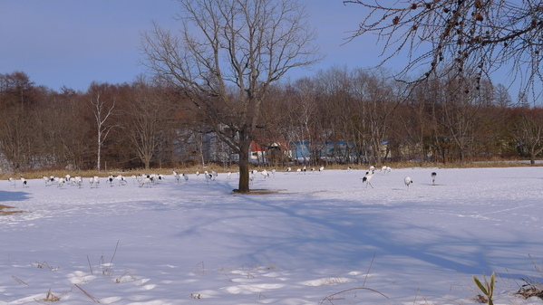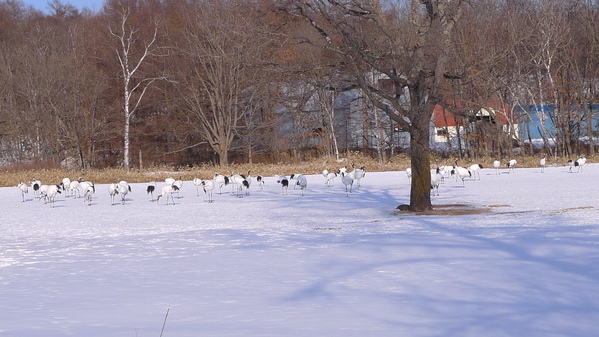 這裡每年從十月下旬到三月底之間,每天清晨和下午2:30「渡部」奶奶都會固定給餌餵食,我們下午2:50到,餵食已經結束,鶴見台上的鶴群幾乎每一隻的頭都是栽在雪地裡,非常認真。