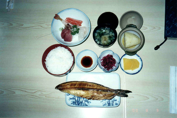 我點的"鄉村定食"烤魚+生魚片+海帶+漬物+味噌湯+白飯=1600円