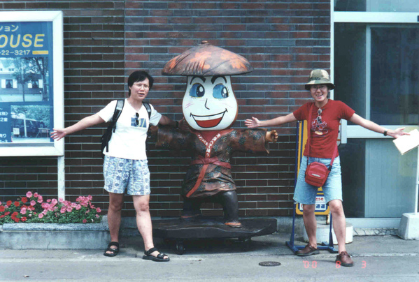 回到富良野市 富良野小學中立著一塊石頭,這裡是"北海道中心標" 因此每年到了七月底,富良野是就會舉辦"肚臍祭" 因為肚臍是人的中心,而這塊石碑就像是北海道的肚臍 我們八月初來,祭典剛結束不久,仍到處看到"肚臍祭"的宣傳 車站前擺的這一尊就是"肚臍祭"娃娃,舞步果然非常日本