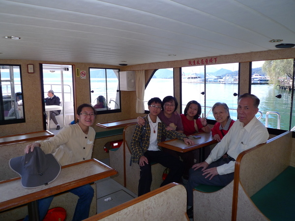 我們坐在船艙裡,一邊欣賞美麗的湖景,一邊聽著船長幽默的解說~~提到每年萬人泳渡日月潭的盛況,今年人多到不必游就會被推到對岸,有人穿著救生衣,漂到醫護站就吃吃喝喝,花了4個多小時才游完全程,所以建議我們即使不會游泳明年也可以來參加,讓我們聽了心動不已。