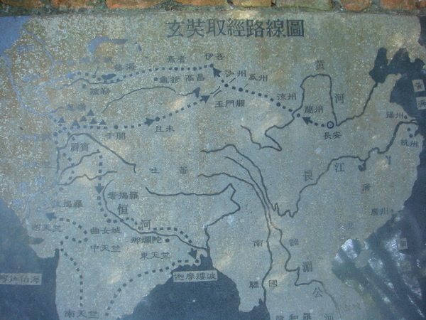 廟邊刻著「玄奘取經路線圖」,我們一行人沿著虛線箭頭想像唐僧行旅途中的艱險,佩服不已,即使在交通如此發達的現代尚且沒有勇氣隻身跋涉冒險,更何況在一千多年前資訊不明蠻荒未開時,只靠雙腳徒步化緣就能完成如此壯舉,真實的玄奘大師必定不是西遊記中的唐僧那樣懦弱無能的。