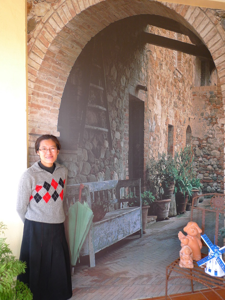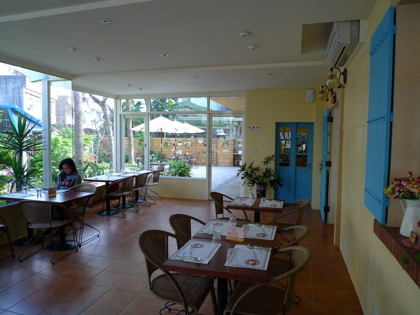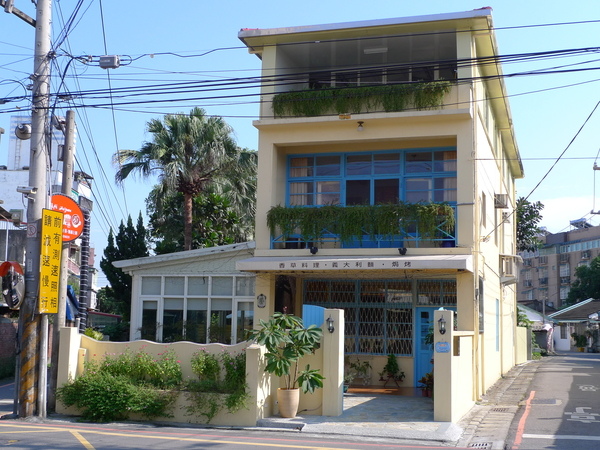 獨棟餐廳地坪頗大,由一般的民宅改建而成,橘牆、藍窗、綠籬,餐廳入口處牆邊的大幅石牆小巷的風景海報,讓人有置身異國的感覺。
