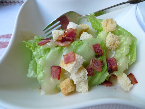 凱薩沙拉:除了生菜、麵包丁,還灑了數量不少的培根片,以如此平價的餐點來說,用料算是豐富的了,沙拉醬頗甜,培根很香,不嗜沙拉的老婆也吃得頗開心,差一點被她一個人吃光。