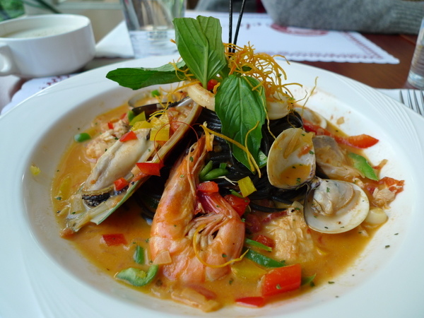 蕃茄海鮮墨魚麵(220元):黑色的墨魚義大利麵,口感不錯,而且不會吃得滿嘴黑黑的;用料相當豐富,有鯛魚肉、貝類、鮮蝦、花枝圈、甜椒、蕃茄.....,紅醬酸度甜度都恰到好處,味道很好,吃完覺得意猶未盡。