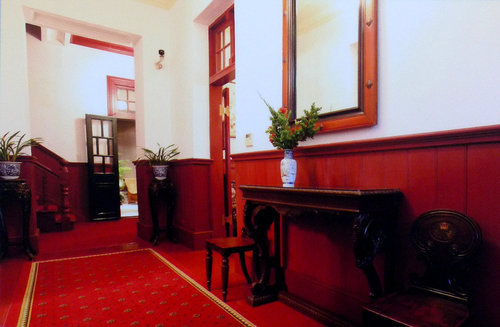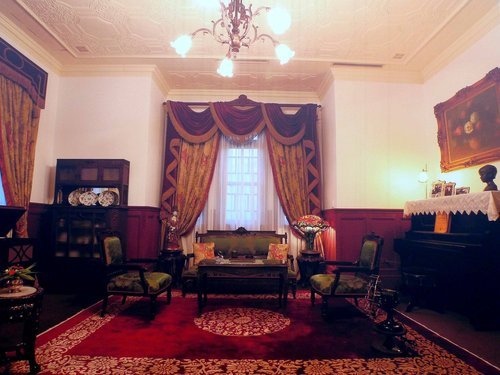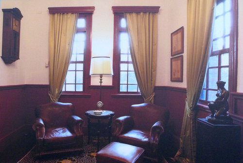 在玄關右側,壁爐上面飾有凸花磁磚,真的有用過的痕跡;天花板為銅鑄雕塑的花草樣式,垂掛著古典英式吊燈;右側的山葉直立式鋼琴和這棟房屋相同年紀,是1915年由日本原裝進口的百年樂器,煥發著時代光彩;客廳地板鋪著一張大紅色有著菊花圖案的天津地毯,地毯上的法式百年沙發,椅面花布面上雕飾著綠色牡丹,手工細緻,旁邊搭配著Tiffany彩繪玻璃鑲嵌桌燈。左側擺設的英國HMV老留聲機、英式古董櫥櫃,處處是名品,再再顯出奢華。