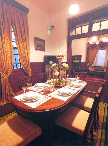 與客廳相對,可供六人使用的小餐桌上擺放著約2百年歷史的英國骨瓷品牌:皇家道爾頓(Royal Doulton),古董餐盤上常春藤蜷曲纒繞的觸鬚佈滿杯盤邊緣,搭配打造成竹子圖案的純銀中式餐具,呈現出當時流行中餐西吃的氣氛。