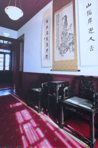 照片中書畫下方的這組廣式太師椅放置在二樓走廊,是當年台灣五大家族之一的鹿港辜家使用過的,呈現出日治時期常以中式家具搭配西方建築的居家佈置。