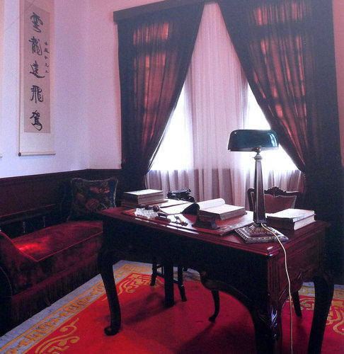 百年前鹿港製作法式洛可可風格的書桌,搭配英式喬治王風格書櫃和維多利亞風格貴妃椅,桌上陳設老書數冊以及打字機,旁邊懸掛的書軸則是康有為的作品。