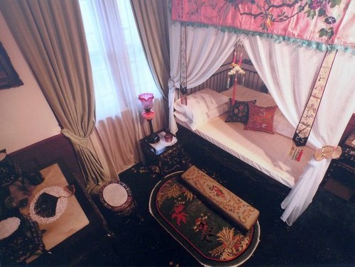 古老的梅花圖案天津地毯上,放著富貴人家考究的老鑄鐵床,由於是女主人的臥室,鐵床可以明顯看出床身較短,如果是我的話,就得屈膝而睡了。
