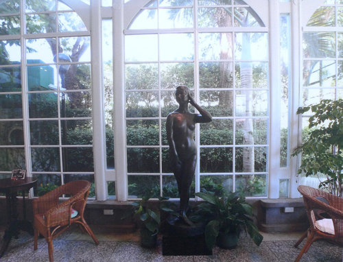 窗外是綠意庭園,屋內展示著這一尊人體雕塑是蒲添生大師的得獎作品,旁邊籐製的桌上放著英國皇家御用、有著250年歷史的Wedgwood骨瓷精品:此套茶具為絶版巳久的經典「花色蝶舞」(Charnwood)茶具,若能在此靜靜地喝個下午茶,欣賞著窗外的花園造景與溫室內的藝術塑像,那真是人生一大享受。