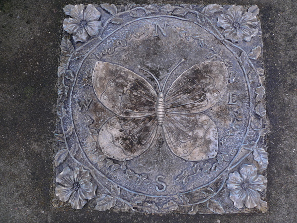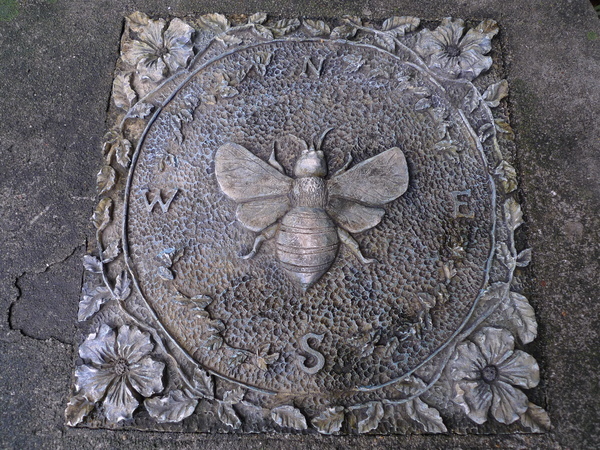 石雕旁的石椅上,鑲嵌著花與昆蟲的浮雕。