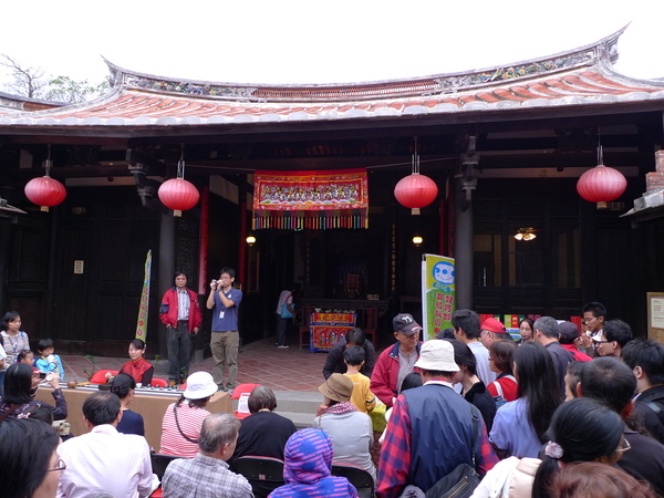 公媽廳前面就是免費喝茶的「花茶殿」,這裡原本應該是莊重肅靜的祭祖聖地,現在卻變成人群熙攘,麥克風全開的賣茶野台,美其名為「花茶殿」,不如更名為「花茶店」比較實在。