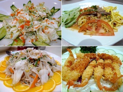 蝦卵優格生菜沙拉、燒鴨日式生麵、黑椒炒龍肉、青江脆鮮蝦。