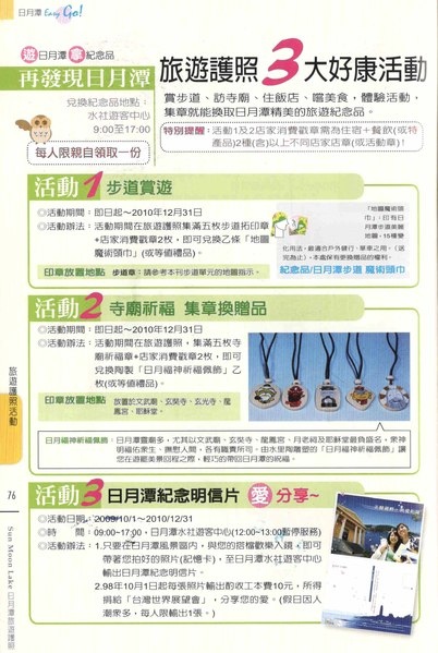 觀光護照裡有環潭地圖、建議行程、步道導覽、店家索引,介紹非常詳盡,憑著觀光護照享有許多優惠,最後三頁還有好康活動: