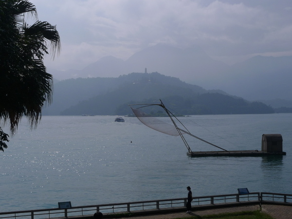 漁家船屋上架著的四手吊網,將網子的四個角與交錯的兩支竿子綁在一起,放入水中後,再利用槓桿原理將水中的網子抬離水面,漁船在潭上巡迴捕魚,漁網有如被四隻手一起拉起,所以稱作「四手吊網」,有點像抓娃娃機的感覺。