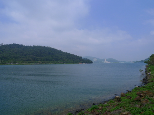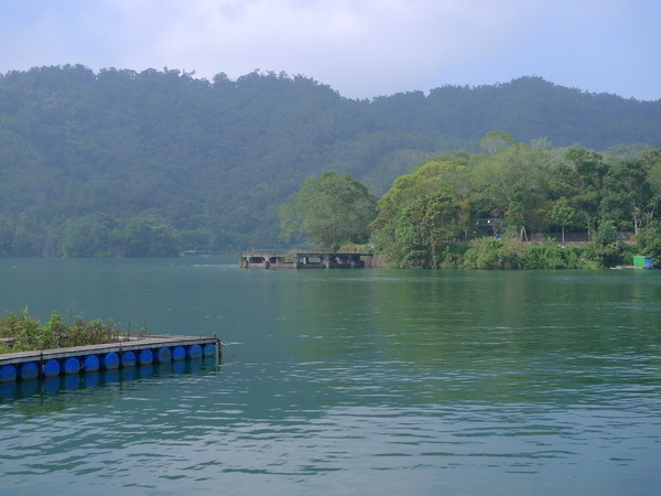 右邊看似橋墩的是日本人所建的溢水口,日月潭水庫滿水位時,水就從這裡流出。
