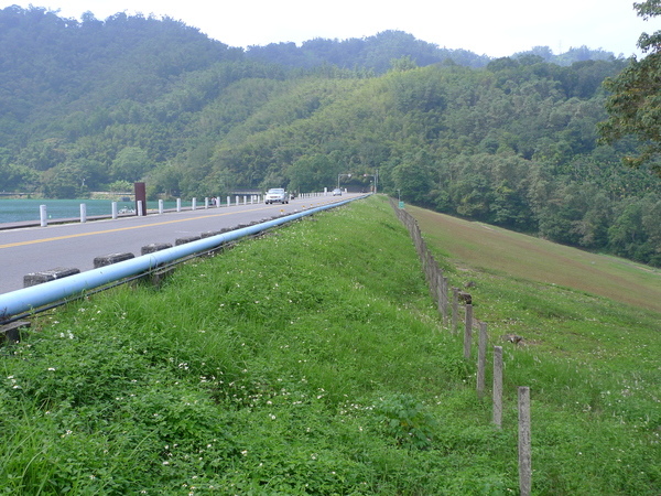 穿過馬路往下探看,這片斜坡就是日治時代建造的混凝土堤壩,現在已經長滿綠草了。
