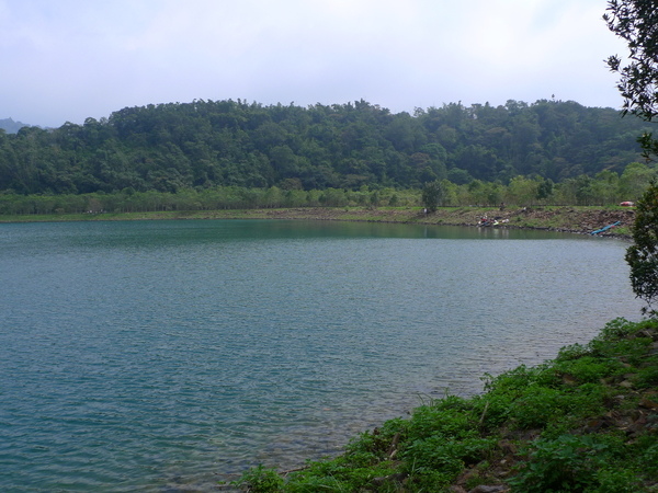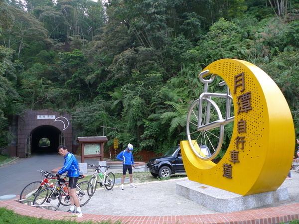 我們在這個路口來回多次,都以為只准自行車通行,後來才知車子也可以開進去,穿過隧道之後,我們把車停在「露營區」的停車場,開始沿著狹長的月潭散步。