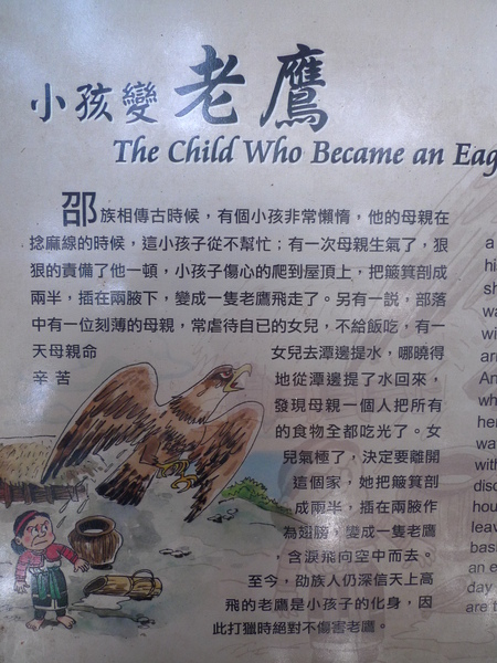 老鷹是小孩子變的,傷心的小孩把畚箕插在兩腋,變成老鷹飛走~~想像力真豐富,好玩!