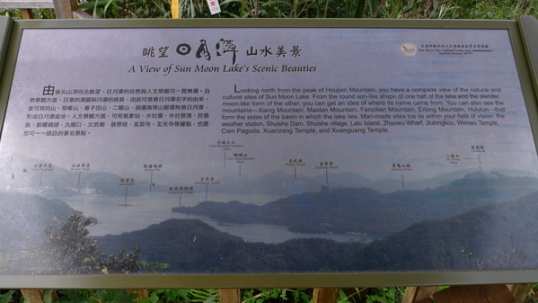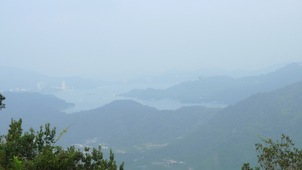 我們找角度找了半天,最後發現要站到涼亭的桌上才能真正看到全景,可惜今天空氣不是很乾淨,能見度有限,只能在朦朧中欣賞日月潭景色。