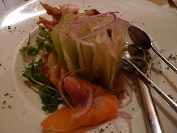 雙色是指「軟殼蟹」和「煙燻鮭魚」,加上生菜,淋上油醋醬。
