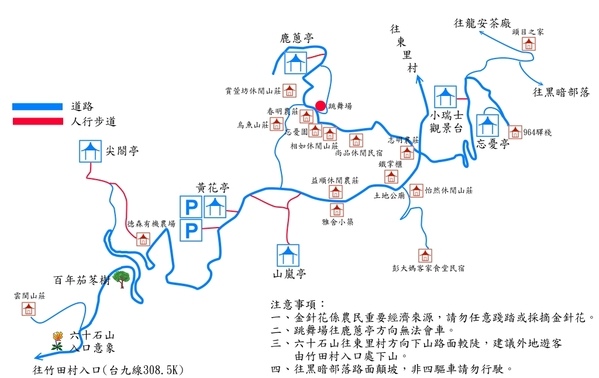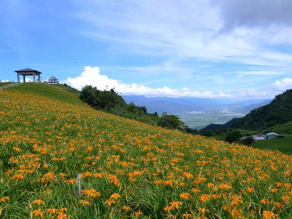 六十石山最高點「忘憂亭」就是以金針花的別稱「忘憂草」命名,海拔946公尺,擁有六十石山最寬廣的視野,整座山頭、花東縱谷盡收眼簾,美景當前,令人忘憂。