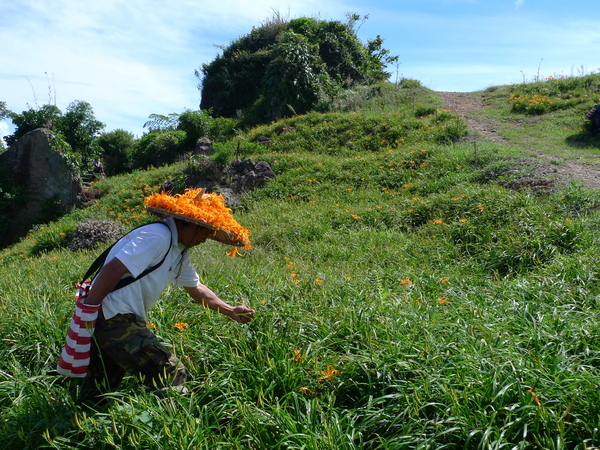 這位農夫把金針花做成醒目的金針花斗笠,邊唱歌,邊採花,很能自得其樂。