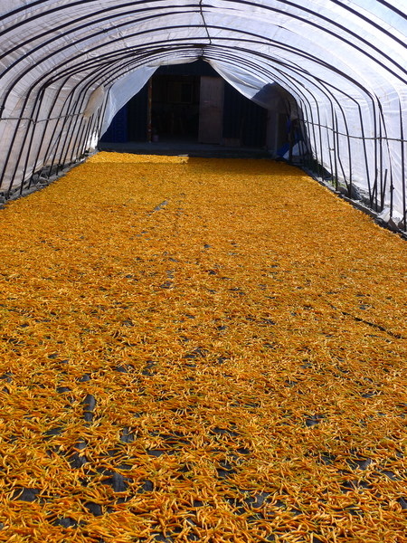 採下金針花-->浸泡二硫化物(讓花定型定色,否則花苞還會繼續綻開)-->曝曬一天(繼續曬也不能完全乾燥)-->裝筐-->烘乾-->食用。