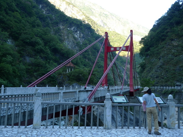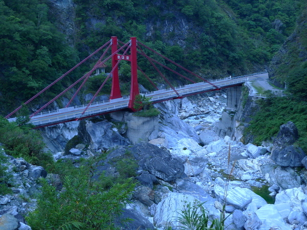 紅色斜張鋼橋,橋頭橋尾都有虎虎生風的大理石獅子坐鎮,橋下是「立霧溪」和「荖西溪」會流處,「花蓮八景」的「太魯合流」就在這裡,可以欣賞V型峽谷、岩層摺痕和大理石紋理的溪流美景。
