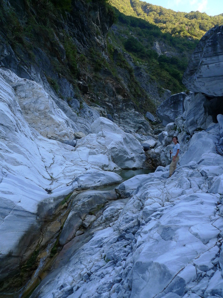 「......沿著河床走,可以欣賞白色大理石,感受河水的清涼,之後會接回步道。」