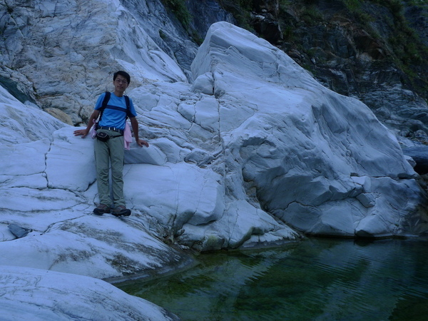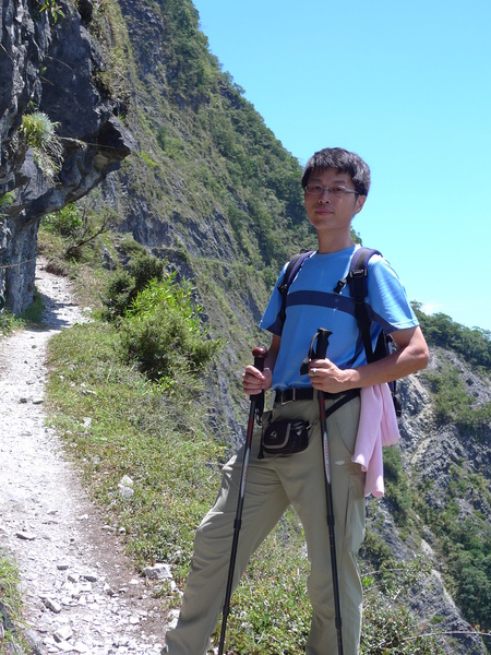 平常喜歡爬「皇帝殿」、「五寮尖」、「鳶嘴山」這些攀岩路線的王先生,走到這一段,一直說他有懼高症,軟腳,要幫我們夫妻合照之前,必須先找到安心的立腳處才行,所以我們非常小,但是也真實對比出人在大自然中的地位!