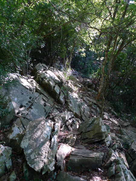 開始出現巨石排列的「流籠路」,循著大理石岩稜一路陡上,我運動神經不佳,又有點懼高,不得不變成爬蟲類動物。