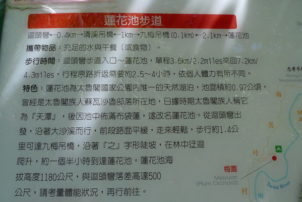 去程--2小時(迴頭彎--30分鐘--九梅吊橋--60分鐘--角階台地--10分鐘--蓮花池--20分鐘--祖輪山登山口);