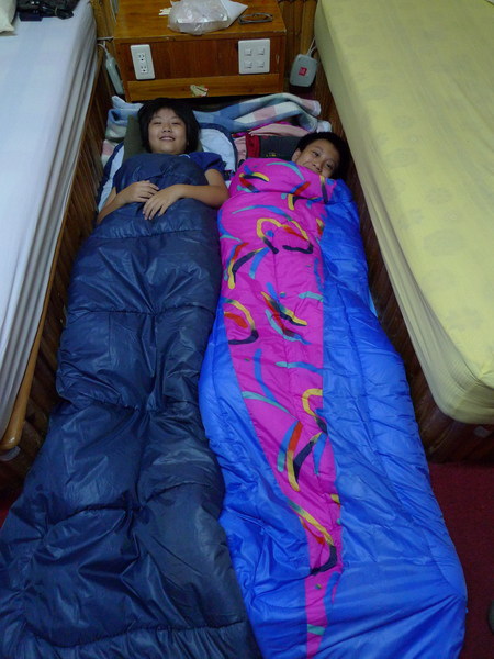本來以為夜遊半小時就會結束,沒想到回來已經快十點了,自備睡袋打地舖的兩位小朋友後來竟然是五人中睡得最好的,睡在床上的三位大人都因蓋被太熱不蓋太冷而睡不安枕,大家竟然搶著以後誰可以睡地板,傷腦筋!