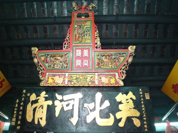 光緒14年瘟疫大流行,光緒15年(西元1889年)建廟驅除瘟疫,門口高懸"笑比河清"匾額,匾額上面的船型雕飾和"下環福德祠"的形狀一樣。