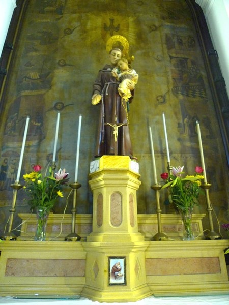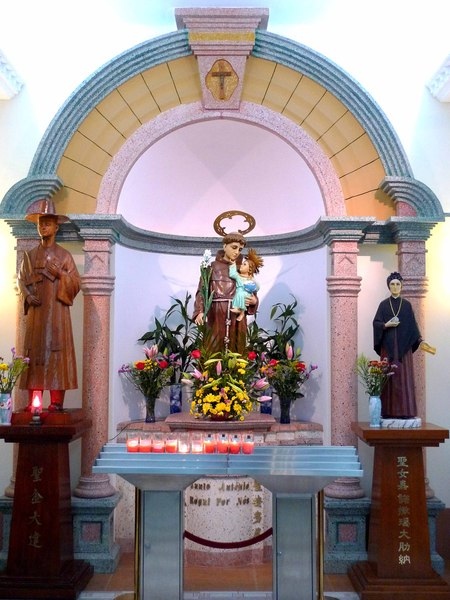 隔壁一間的小祭壇供奉著聖安多尼(中)、聖女嘉諾撒瑪大肋納(右)、聖金大建(左),"聖"是對聖者名號的尊稱。