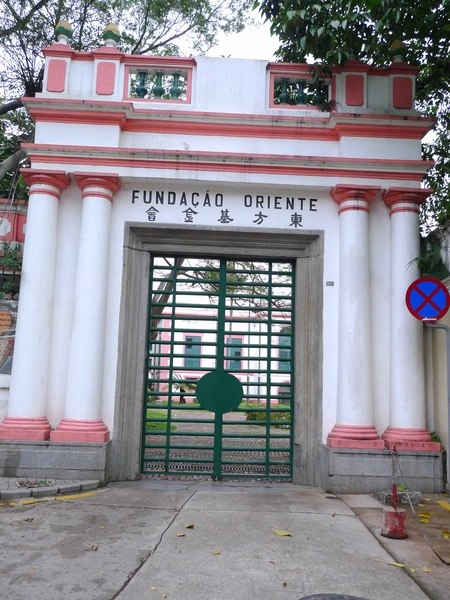 在「白鴿巢前地」很容易就見到東方基金會會址的建築物,建於西元1770年代,原來是澳門富商俾利喇的別墅,到西元1885年時成為澳葡政府的財產,曾改做賈梅士博物館,現在為東方基金會會址。