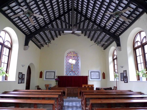 教堂的外觀與內部都相當簡單樸實,屋頂是英國垂式屋架,和天主教教堂華麗挑高的建築大異其趣。