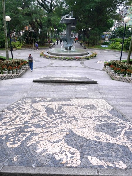 水池周圍的地上有"十幅石拼畫",尤其是階梯旁的兩幅最有氣勢。