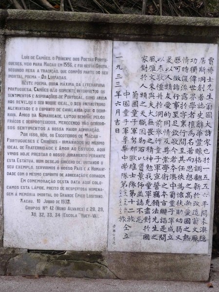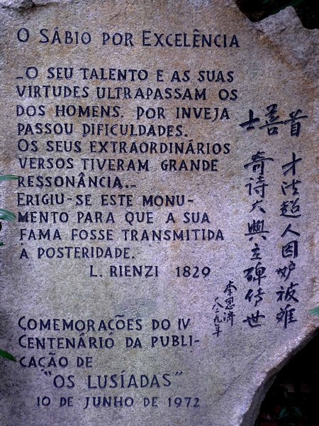 銅像左右分別有石碑讚頌他:"偉大的人道主義詩人,葡萄牙大同精神的象徵~賈梅士"、"首善士~才法超人因妒被難,奇詩大興立碑傳世"。