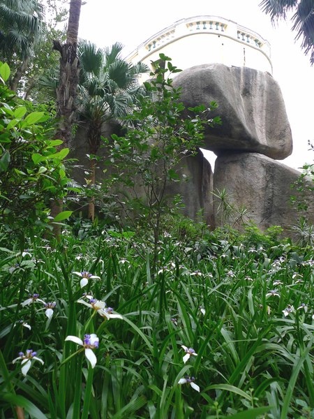 觀景台下很多巨石,旁邊長了成片美麗的花朵。