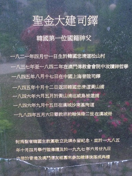 聖金大建:韓國首位天主教神父,曾於十九世紀中期來澳門研習教義,當時才16歲,24歲在上海成為神父,之後回到韓國傳教,不久就在祖國殉道,當時才25歲。