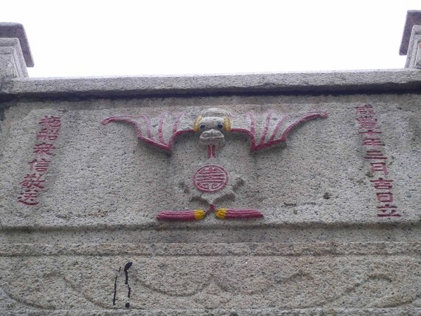 走下寺廟階梯,看到圍牆上方蝙蝠(諧音"福")造型的圖紋,是"咸豐十年三月吉日立",由"拖船信眾敬送","拖船信眾?"