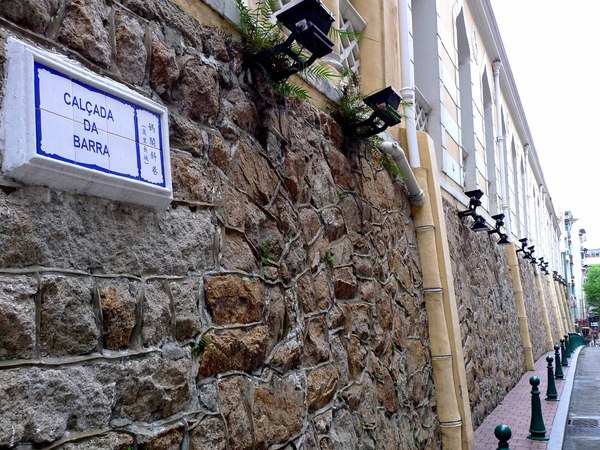 比較特別的是,這幢華麗的建築下有一片很有味道的石牆,葡式磁磚上摽示『媽閣斜巷(萬里長城)』,