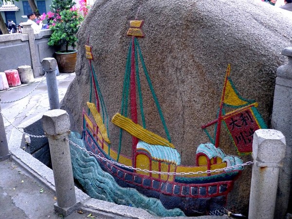 廟的右側有一顆叫做"洋船石"的大石頭,距今已有四百多年歷史,石刻內容的典故就是源自媽祖海上救人的故事:有了媽祖庇護,船隻都能船尾高掛紅色"大利涉川"大旗,並且有藍白色浪濤幫助船行,航行順利更便捷。