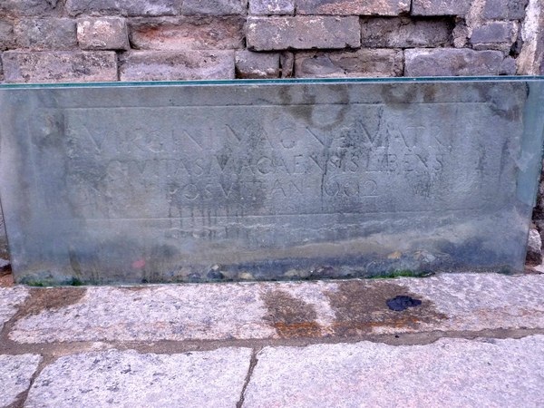 面對牌坊往左側走,可以找到玻璃保護著的牌坊「奠基石」,上面刻著奠基年份"1602年",雖然字跡已經模糊了。
