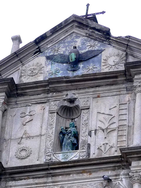 第一層:最上層是三角形山花,頂部立有十字架;"銅鴿"代表聖神,四周圍繞著"日月星辰",象徵宇宙萬物為上主所創造。