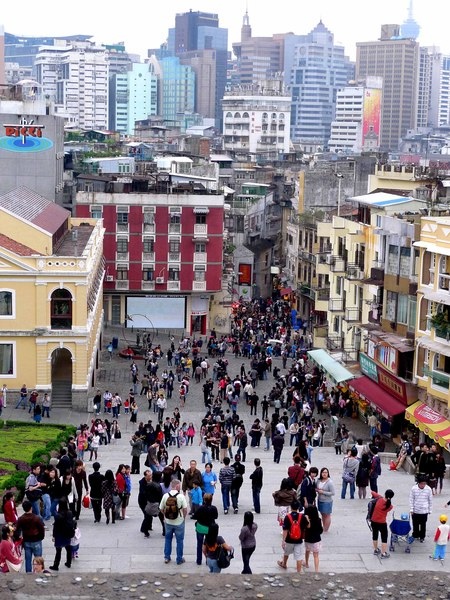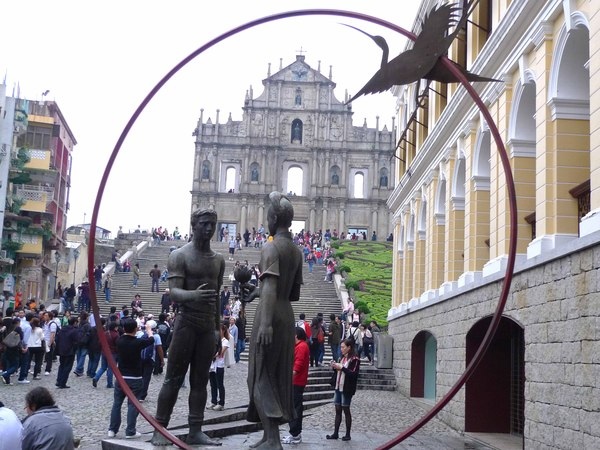 走下石階,遊客服務中心前面遊人如織的廣場不叫"大三巴前地",而叫「耶穌紀念會廣場」。