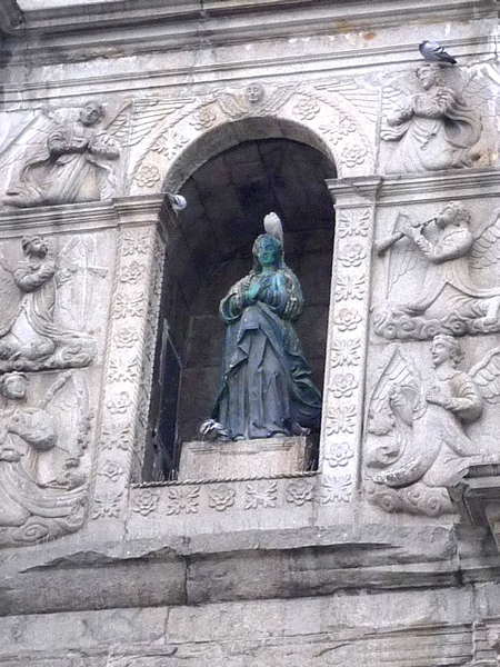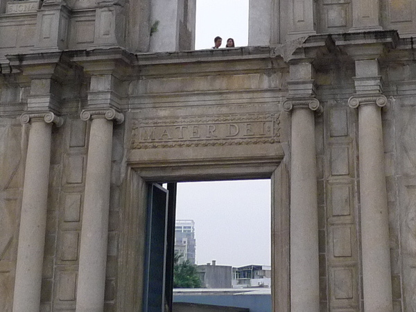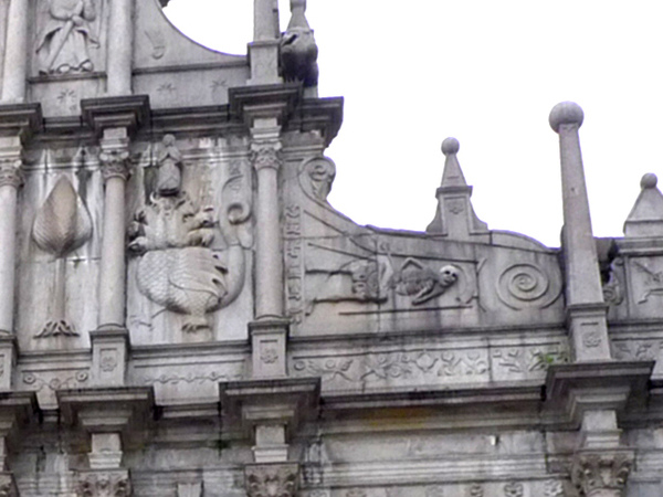 第三層:中央為聖母蒙召升天像,拱門上圍繞著代表中國與日本技師的牡丹與菊花;左右刻有六位天使奏樂歡慶。我們拍照同時,正好一隻鴿子在聖母頭上歇息,從聖母身上的白痕,可以看出這裡是鴿子們的解決大事的好地方。鴿子是聖神的代表,難怪敢在聖母頭上撒野。