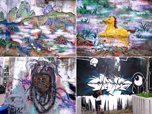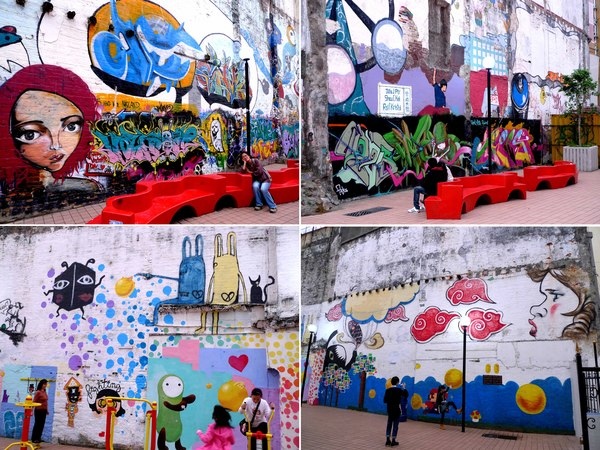 成排房子邊,忽然出現一片空地,原來是老厝拆除而改成的休閒公園,裡面只要有牆面就有塗鴉,而且畫的都很傳神,很多觀光客在這裡拍照,把自己變成畫的一部份了。